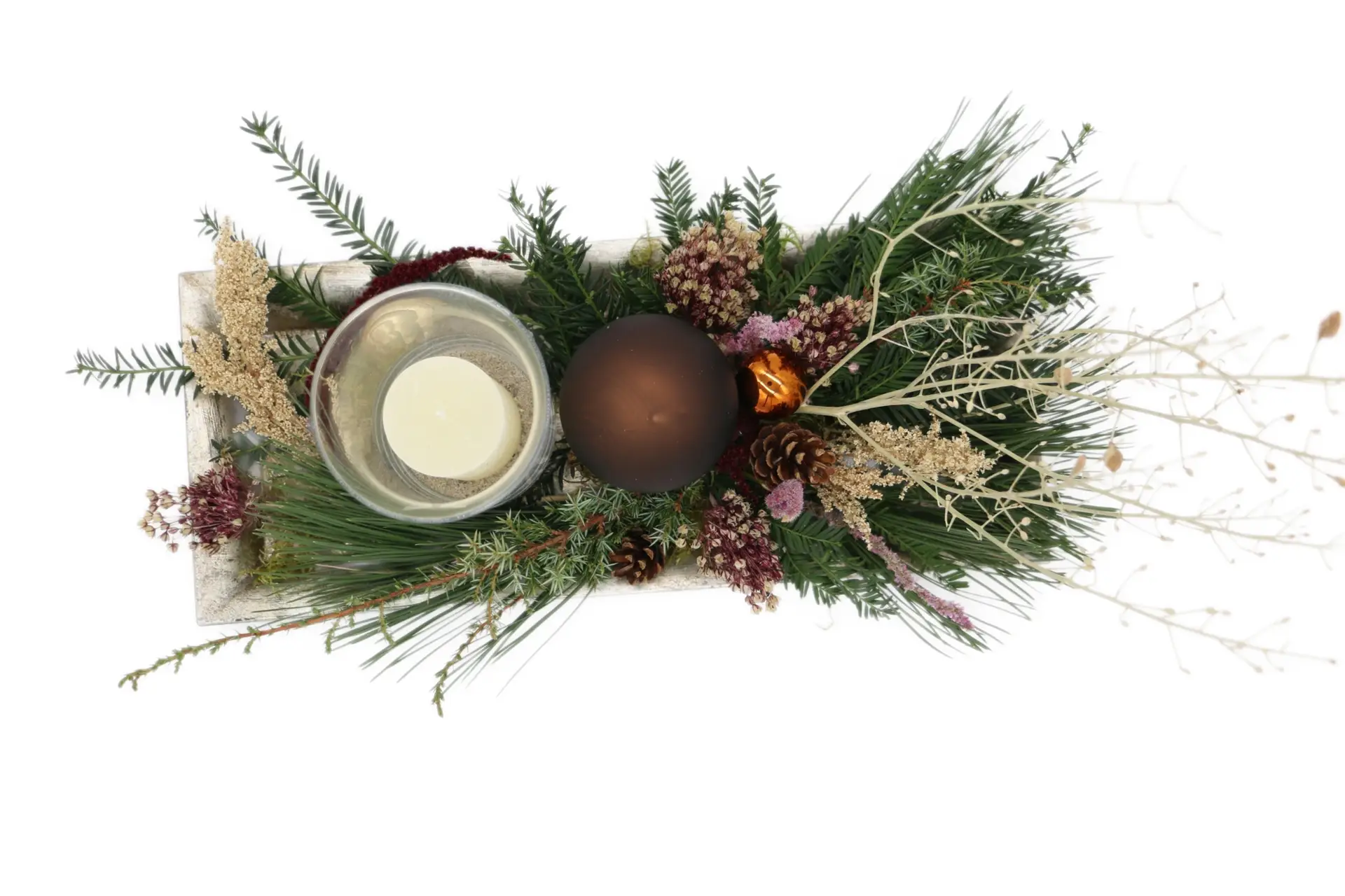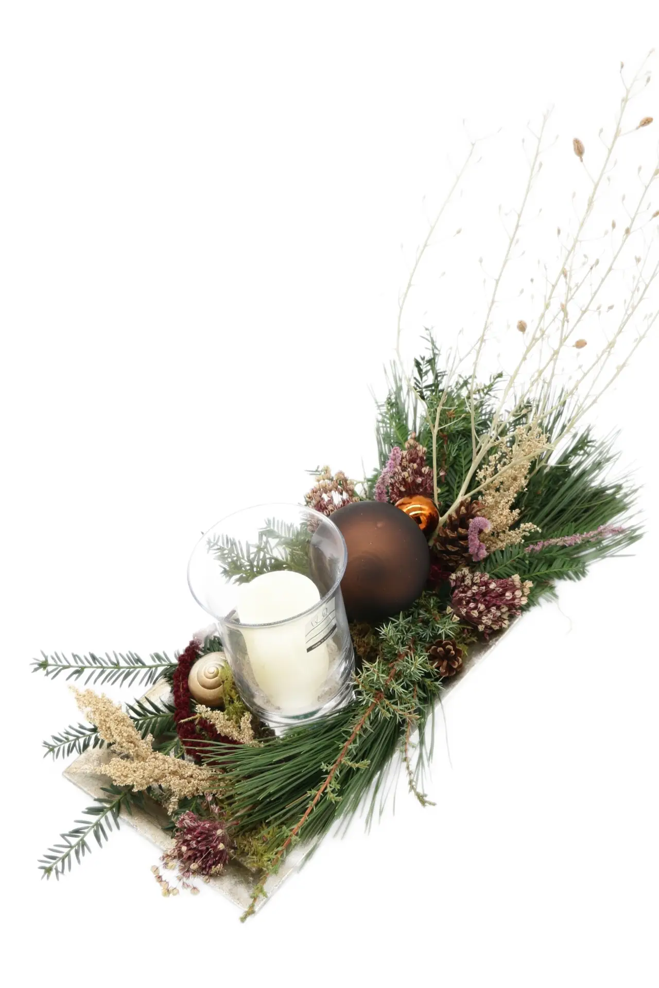 Winterliches Gesteck mit Windlicht